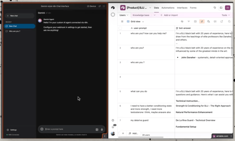 … Et en arrière plan la magie s’opère dans N8N. J’y branche n’importe quelle interface utilisateur (même telegram ou whatsapp) à un un agent IA entièrement customisé (en l’occurence ici mon super coach de JJB).